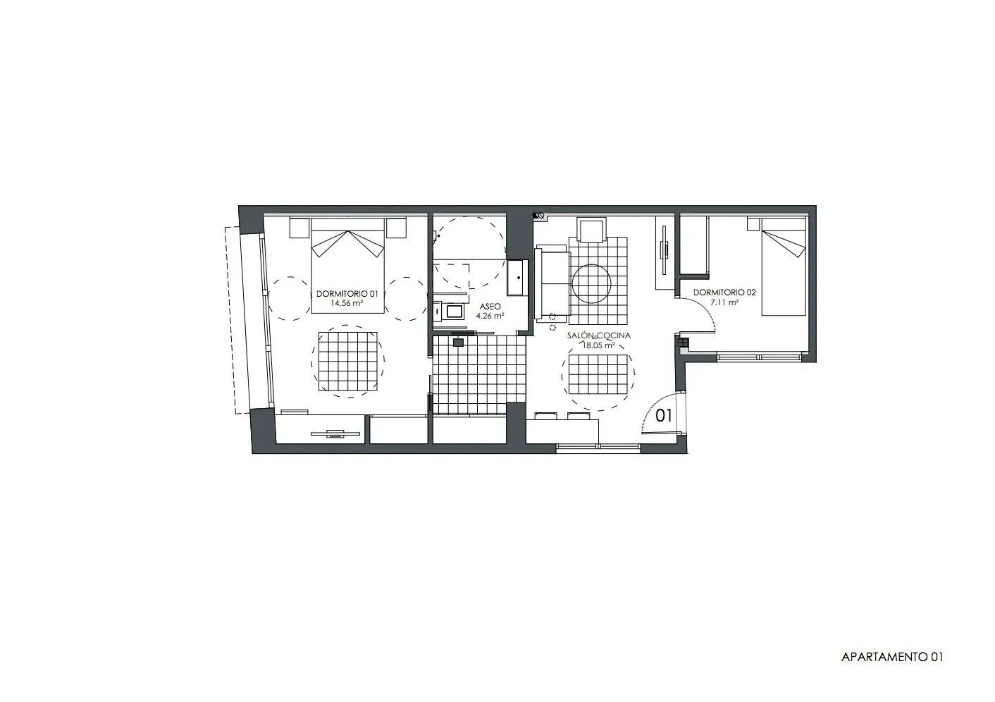 The living room is made up of a 140x200 cm sofa bed, a low table and a TV. The headboard of the main bed, measuring 150x200 cm, separates that room from the rest space. Separated from the living area, there is the rest area with a 150x200cm double bed.