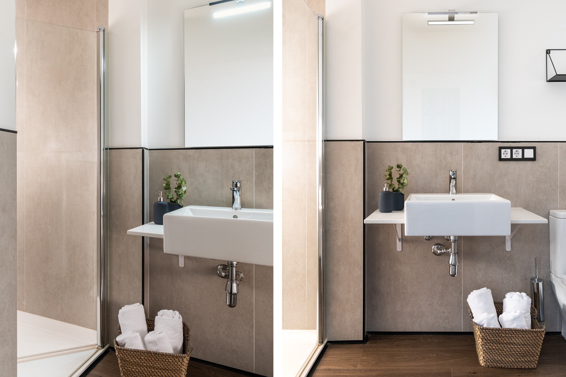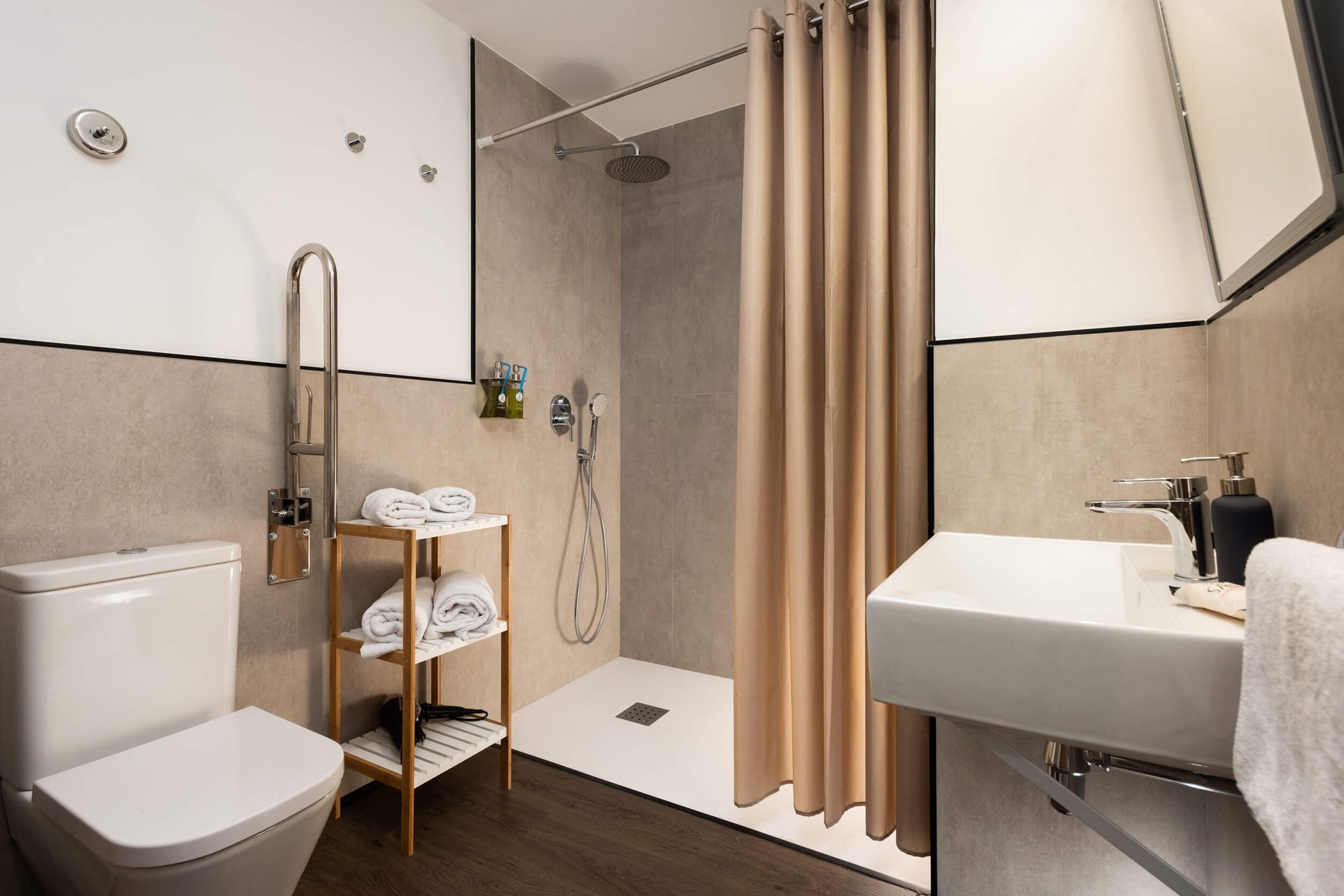 The modern design bathroom is fully equipped with a shower.