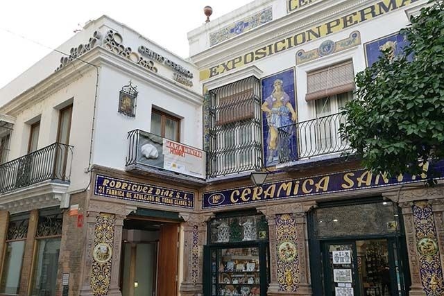 De las arcadas cuelgan tiendas con rótulos de tipografía cerámica: ejercicio perfecto de letras y ornamento trianero.