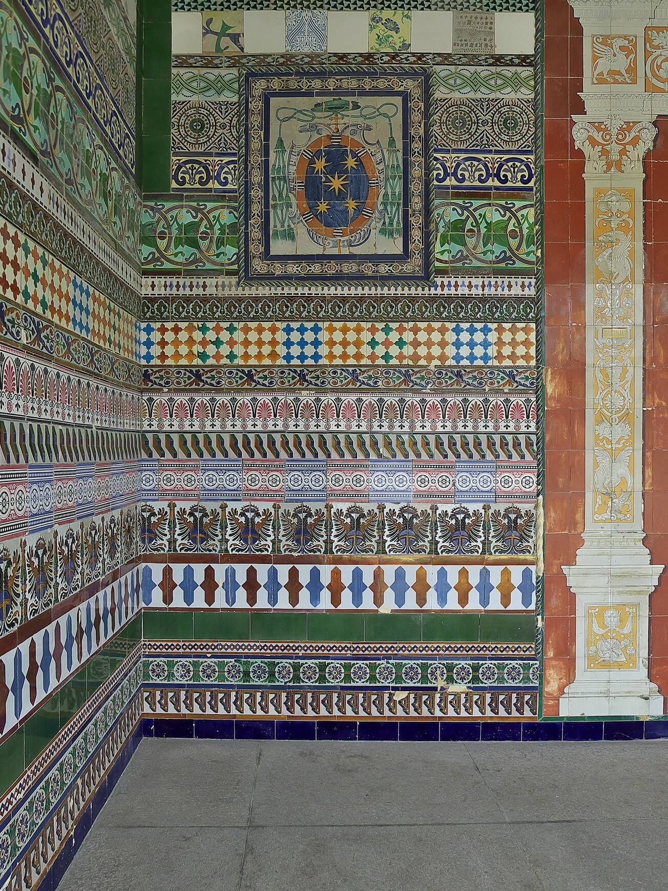 Gran “muestrario” de azulejos: paneles del XVI y composiciones con alicatados y arista. Busca también las inscripciones y escudos.