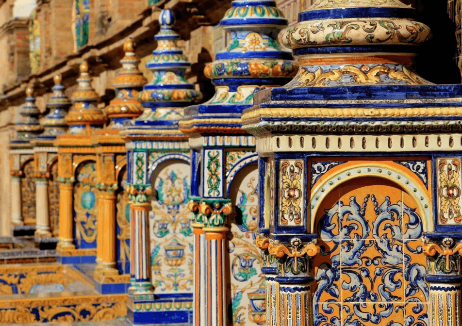 Con las exposiciones de 1929, la ciudad abraza una azulejería histórica y decorativa a gran escala (Plaza de España).